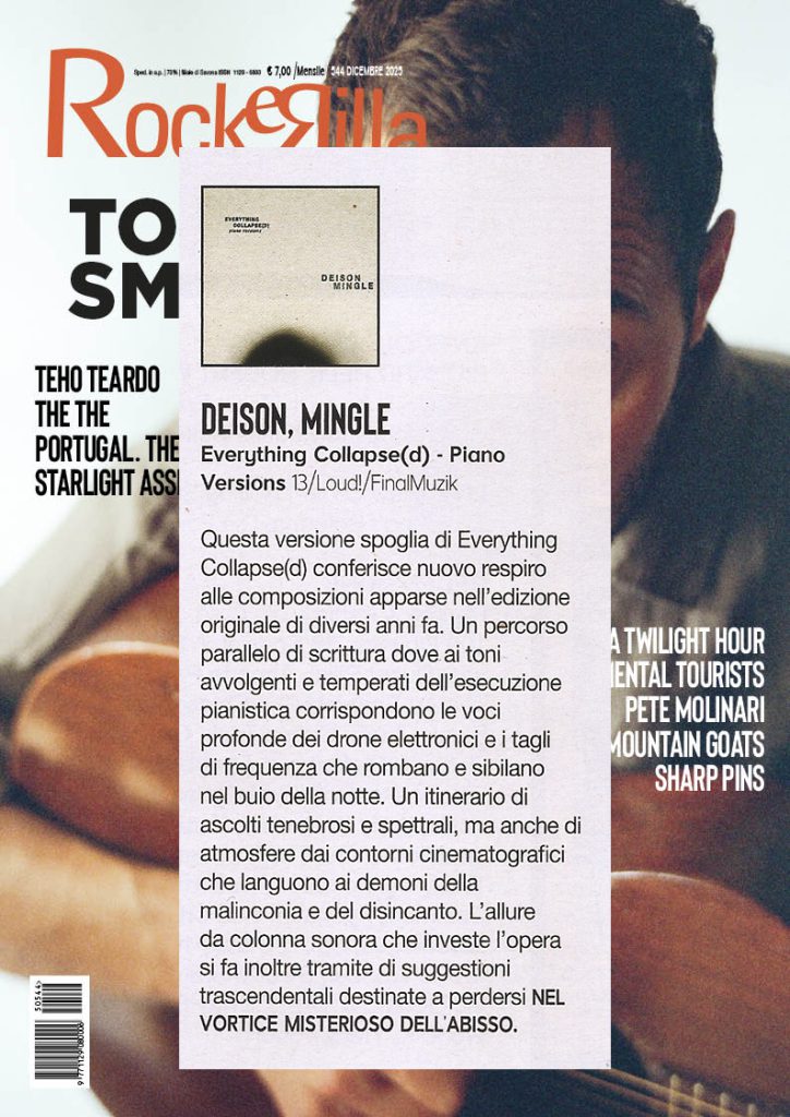 “Pochi mesi dopo aver realizzato il nostro primo album insieme (“Everything collapse(d)”, Aagoo records, 2014) Andrea mi propose l’idea di reinterpretare i brani spogliandoli del superfluo, lasciando solo lo scheletro melodico. Una sorta di reinterpretazione dell’album per soli piano ed elettronica. Come al solito, la maniera fluente, spontanea e immediata di lavorare insieme ci portò a completare il lavoro in pochissimo tempo e a programmarne l’uscita. L’album non fu mai pubblicato perché, nello stesso periodo, avevamo accumulato nuovo materiale che sarebbe andato a costituire il secondo capitolo della nostra preziosa collaborazione.” Questa – dalle note di copertina vergate da Deison – è la genesi di Everithing Collpase(d) – Piano Version, che finalmente vede la luce – su tre etichette per le quali il duo aveva pubblicato – a quattro anni dalla scomparsa di Andrea Gastaldello/Mingle.