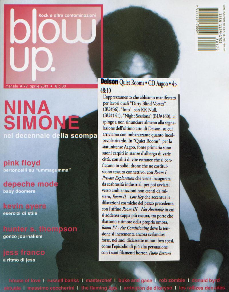 Collaborare per Deison significa soprattutto arricchire uno stile parecchio essenziale. Senza ospiti di riguardo intorno, Cristiano torna a una sorta di purezza drone, per un disco buio ma non dark ambient. Sarebbe troppo facile, infatti, accostarlo a certe uscite di genere, ma in realtà è più vicino alla musica di ricerca e sostanzialmente distante da vari cliché gothic e industrial, per quanto sia come artista sia come ascoltatore lui mastichi tonnellate di quella roba. Quiet Rooms è un’avventura insonne in giro per un albergo non necessariamente infestato da spiriti maligni o gemelle morte ammazzate dal padre. Quello che si vive è uno stato liminale che non è veglia e non è sogno, una condizione di non perfetta lucidità, che però non ci rende troppo vulnerabili. Tutto suona ovattato e straniante, non spaventoso. Qualcosa ci dice che non dobbiamo stare tranquilli, ma è una sensazione sepolta nell’inconscio, non la percezione di un pericolo incombente. Magari lavoriamo semplicemente di notte (Night Sessions è il titolo del disco di Deison uscito nel 2011 per Silentes), siamo solo a pezzi e sappiamo che la realtà non ci apparirà mai come se fosse giorno: questa è la sensazione di “alterità” che l’album sembra trasmettere, tra il suono dei tasti di un telefono, il gracchiare di un ricevitore e altri rimandi al quotidiano presenti in forma di “field recordings”.
